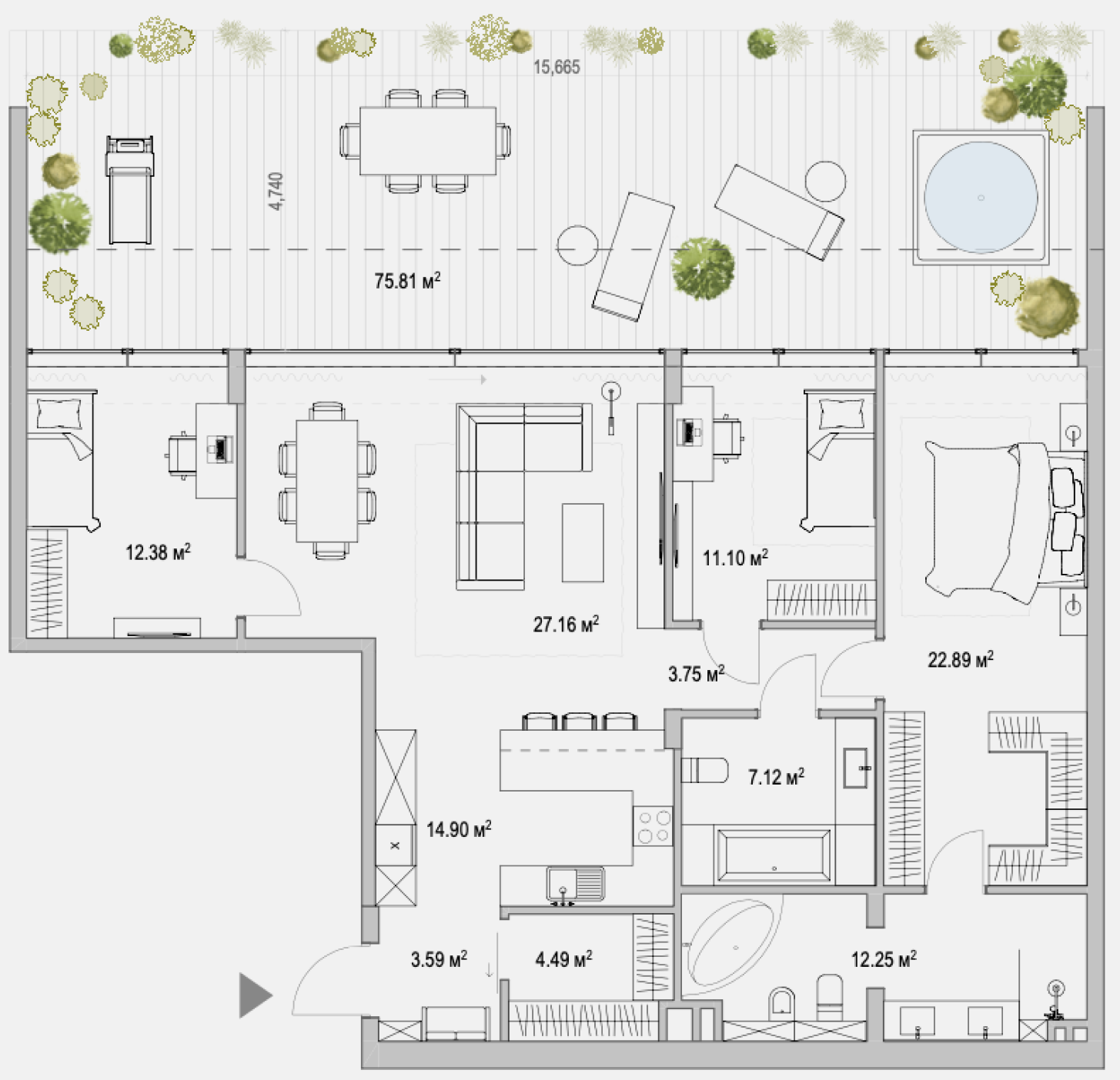 Новаторская архитектура - интегрирование домов в ландшафт холмов позволило создать каскад пентхаусов. Большая площадь пентхаусов, просторные террасы и, конечно, все видовые.